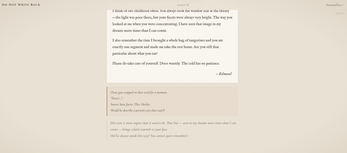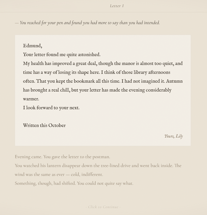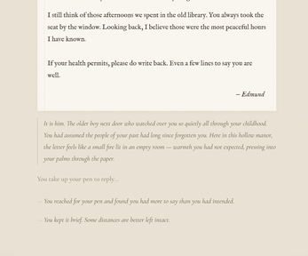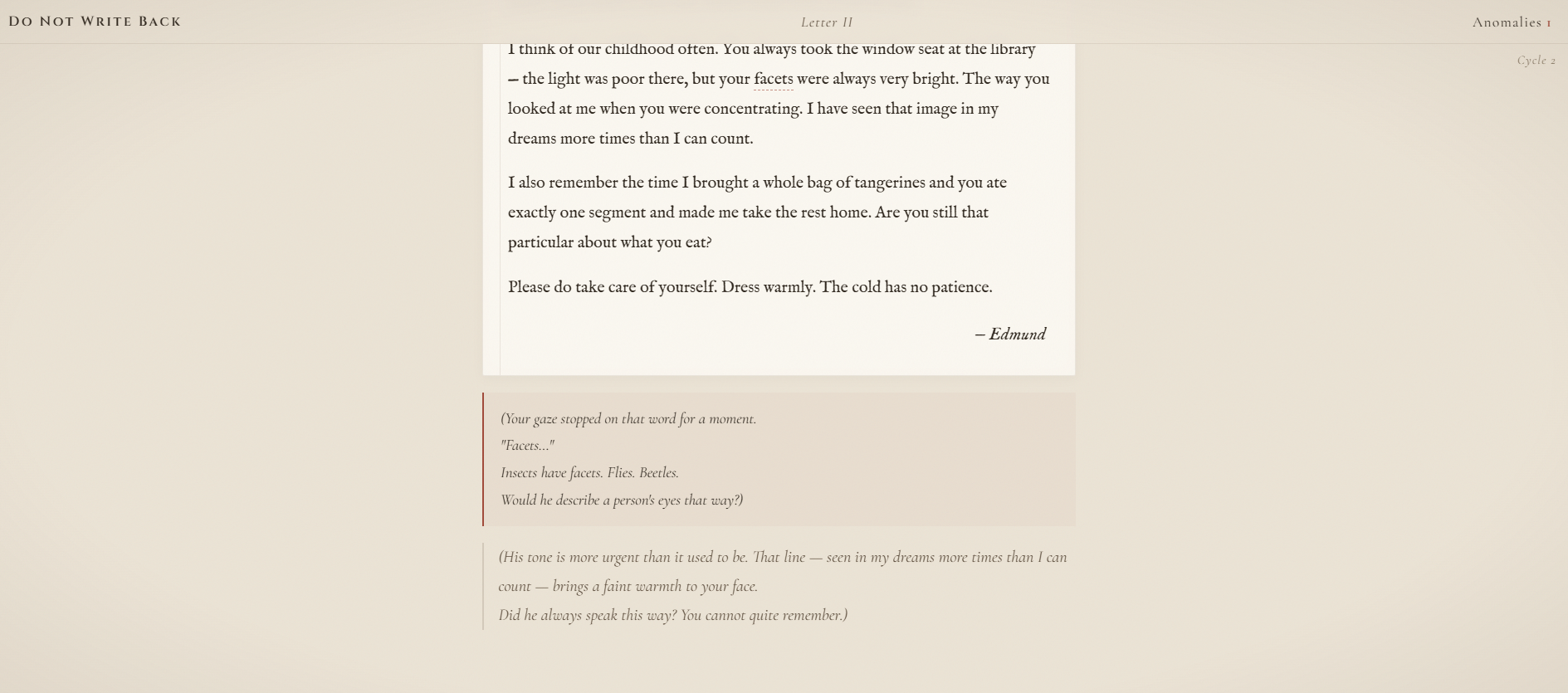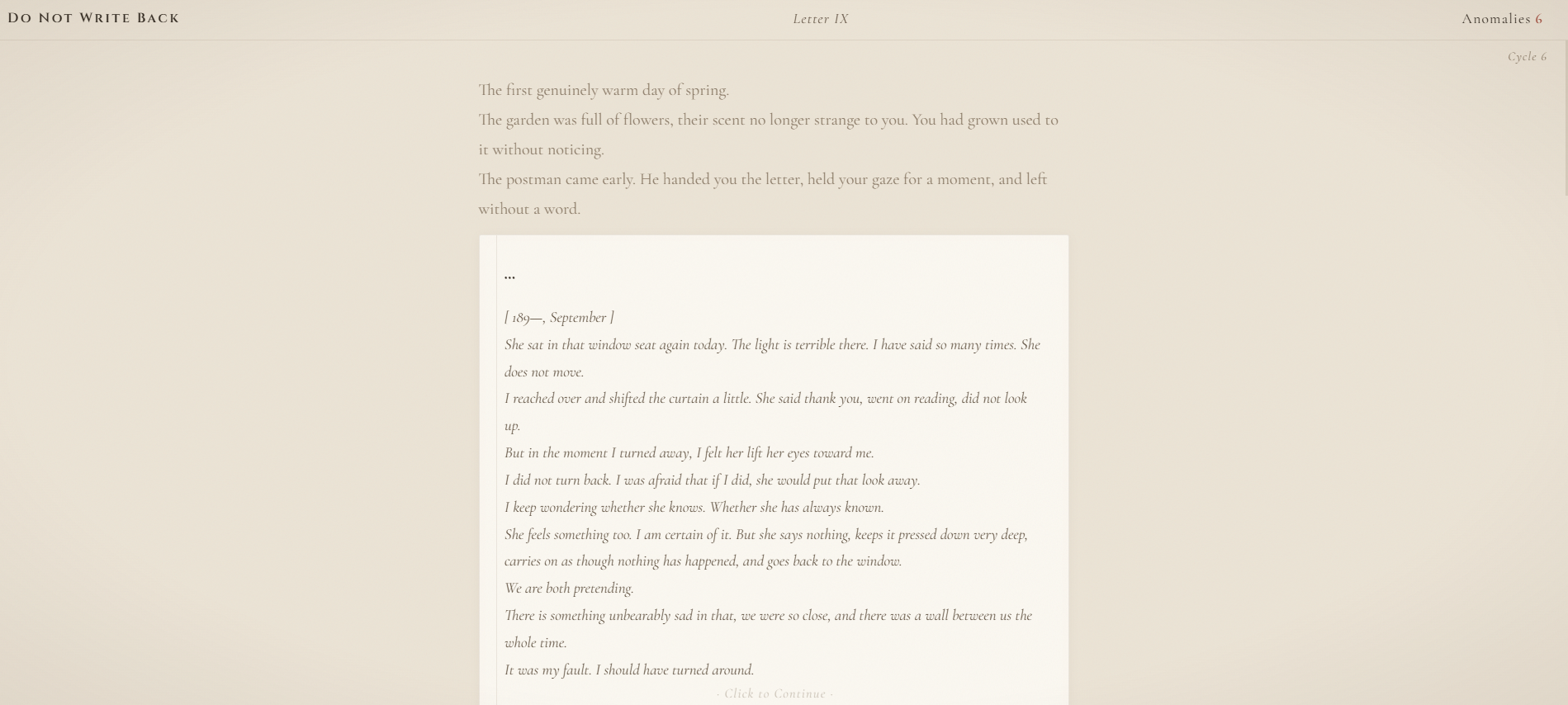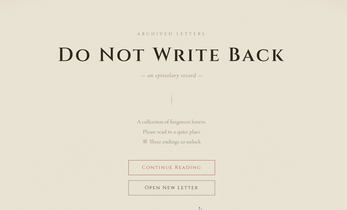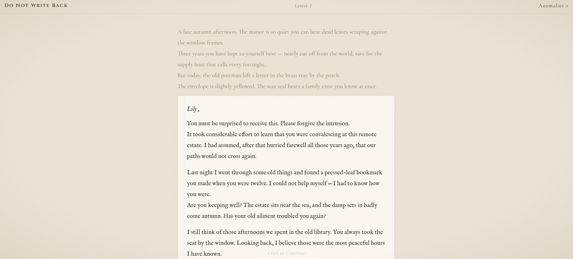 Do Not Write Back is a literary mystery told entirely through letters. Nine exchanges across a single season. Your replies shape the story, and your attention shapes the ending.
